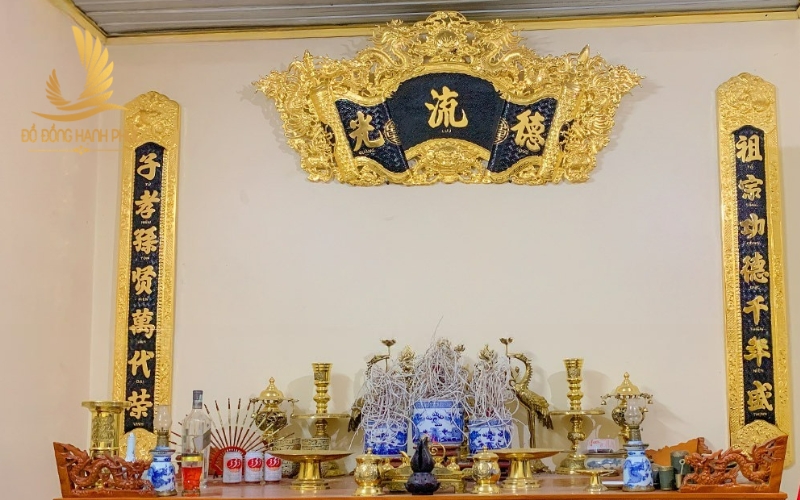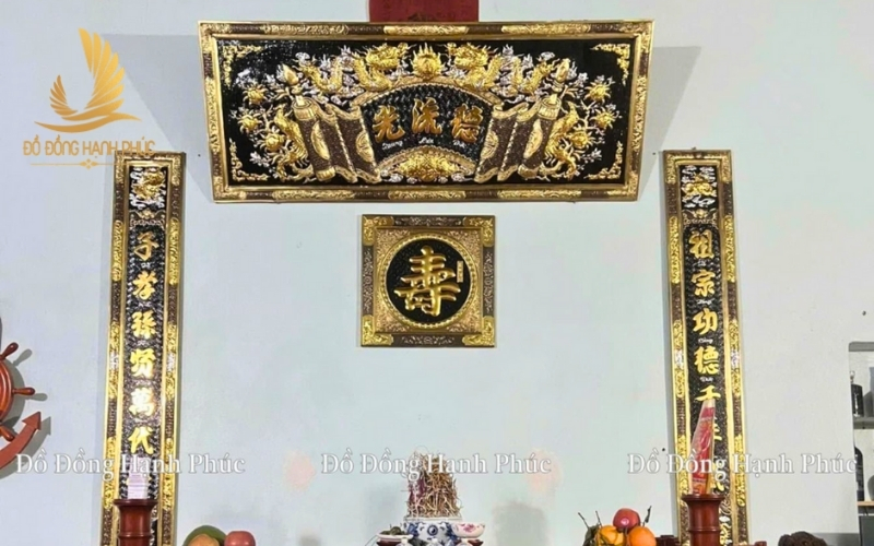 Vị trí treo câu đối: Hai bức câu đối thường được bố trí treo thấp hơn cuốn thư một khoảng vừa phải, tạo thế “trên – dưới” rõ ràng và cân xứng. Thông thường, câu đối sẽ được ốp sát vào hai cột thờ hoặc hai mảng tường hai bên bàn thờ, đảm bảo khoảng cách đều nhau, tránh lệch bên cao bên thấp làm mất sự cân đối và trang nghiêm của không gian thờ tự.