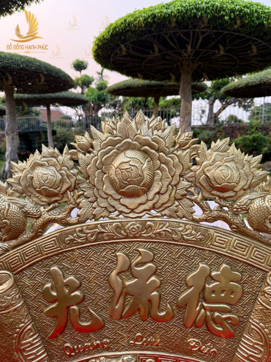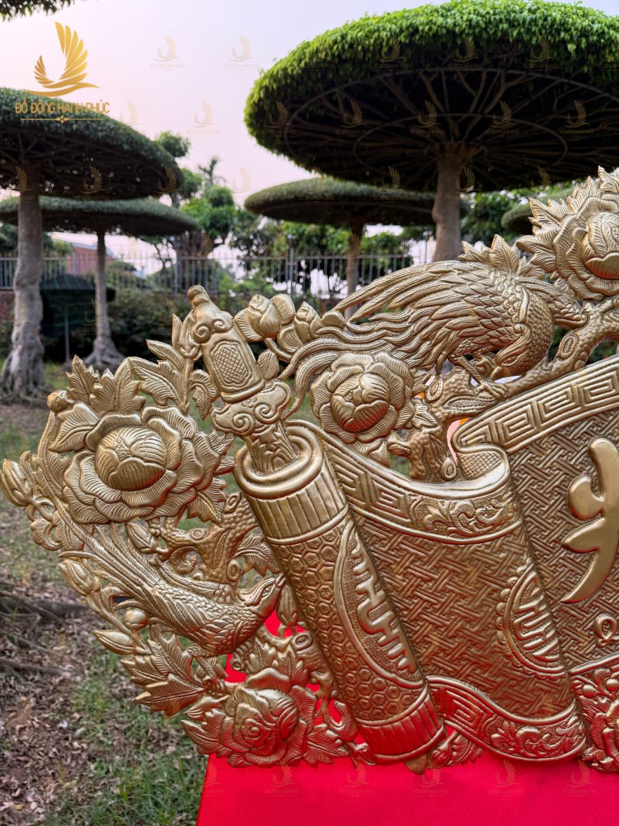 Hình ảnh thực tế của cuốn thư câu đối hồng trĩ bằng đồng cho thấy rõ sự tinh xảo trong từng chi tiết. Từ họa tiết chim hồng trĩ đến các hoa văn trang trí đều được chạm khắc tỉ mỉ, tạo nên tổng thể hài hòa và sang trọng.